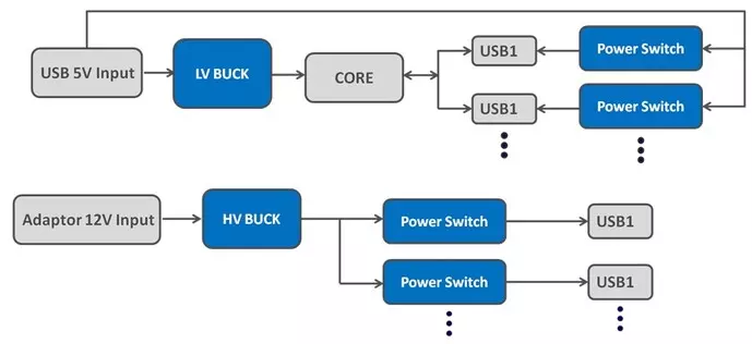 天鈺科技為集線器提供高性能電源解決方案,包含 5V 輸入抑或是 12V 輸入時的多口應用場景下的電源整合。 採用 FCOT 快速反應 IC 兼高效率產品與可調式過電流保護方案將協助您創新並優化各別產品,協助客戶實現高解析度與高品質產品。