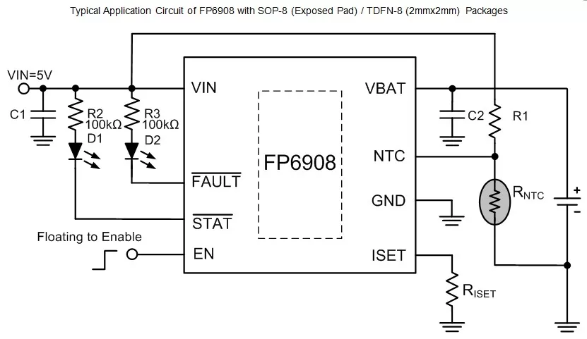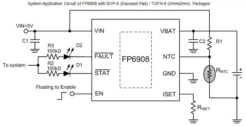 The FP6908 is a single-cell Li-ion/Li-polymer battery charger IC which can be operated with an input voltage as low as 3.9V. The FP6908 can work with various types of AC adapters.