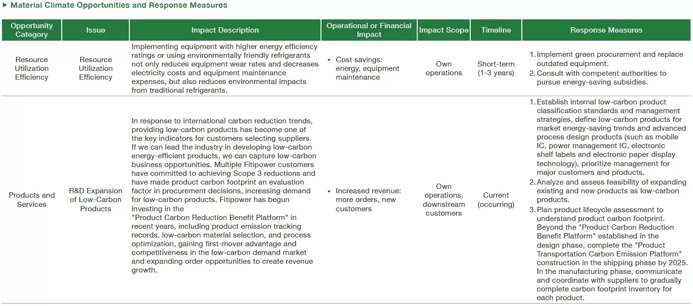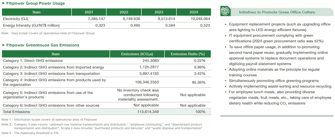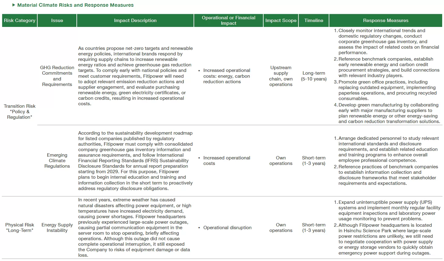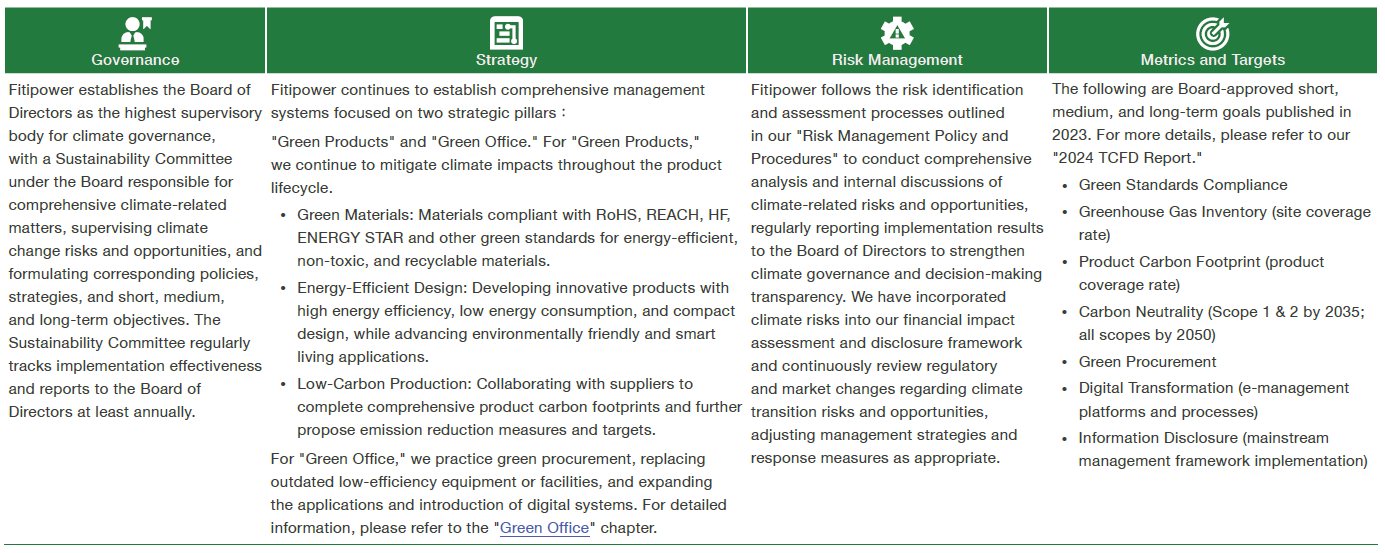 In 2024, Fitipower deepened its environmental risk management and climate governance by formally adopting the full TCFD framework, completing the identification of climate-related risks and opportunities, and further quantifying their potential financial impacts. The comprehensive assessment results are detailed in the Company's 2024 TCFD Report, which has been published on our official website. Fitipower has also launched its greenhouse gas inventory in accordance with ISO 14064-1, with plans to extend the scope in 2025 to include our subsidiary JADARD, thereby completing a Group-wide inventory to strengthen our carbon management foundation and respond to global net-zero trends and stakeholder expectations. Furthermore, a full product carbon footprint inventory and the implementation of nature-related financial disclosures represent our next steps forward.