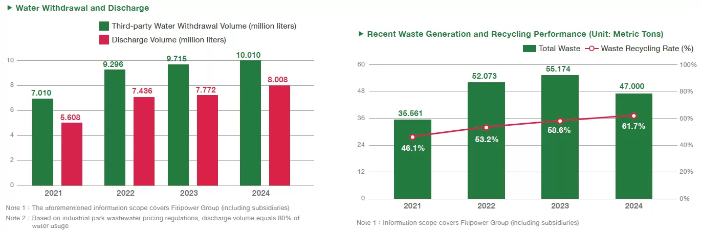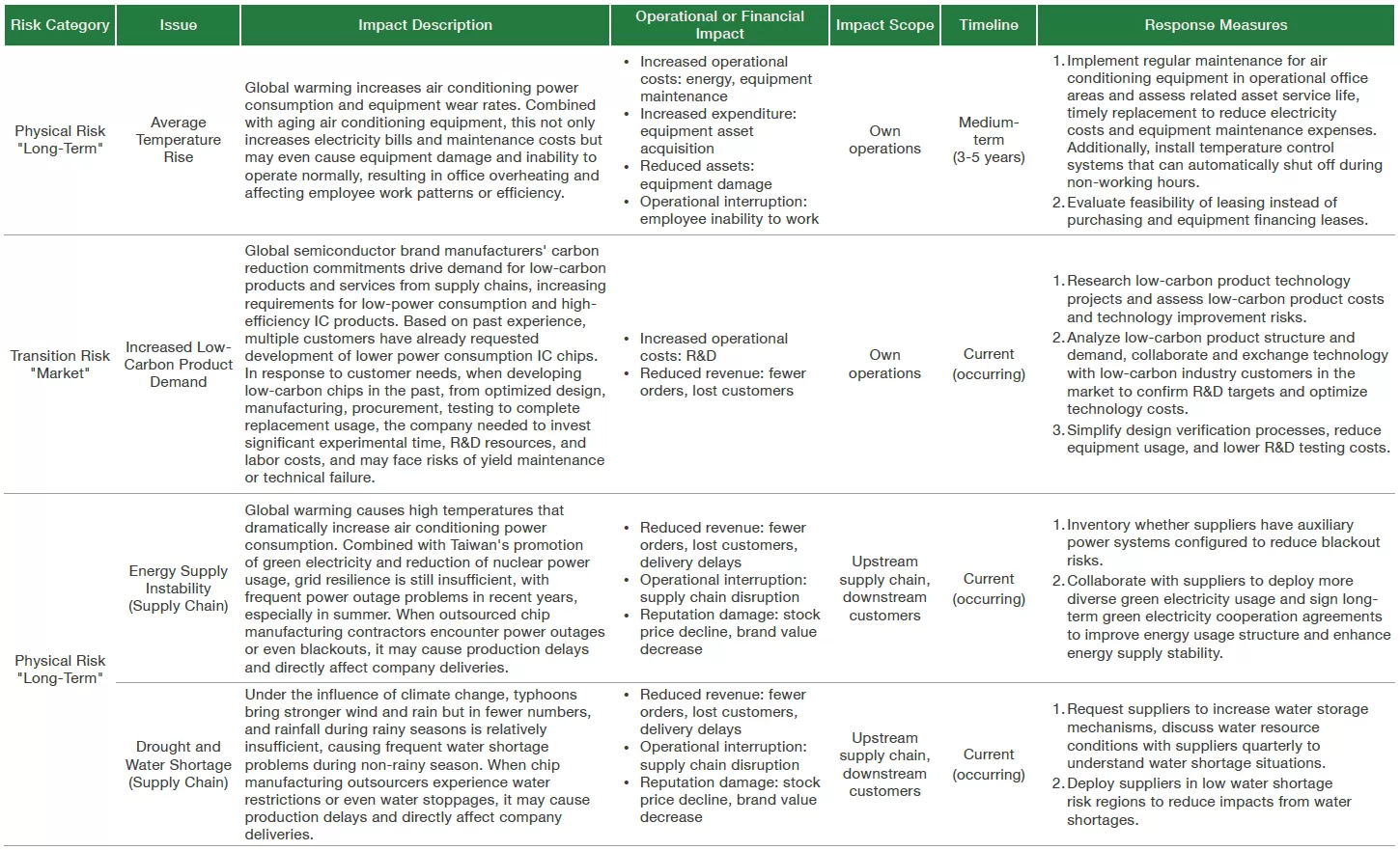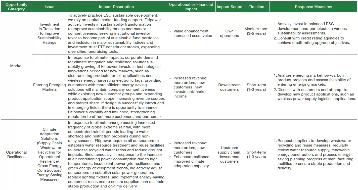 In 2024, Fitipower deepened its environmental risk management and climate governance by formally adopting the full TCFD framework, completing the identification of climate-related risks and opportunities, and further quantifying their potential financial impacts. The comprehensive assessment results are detailed in the Company's 2024 TCFD Report, which has been published on our official website. Fitipower has also launched its greenhouse gas inventory in accordance with ISO 14064-1, with plans to extend the scope in 2025 to include our subsidiary JADARD, thereby completing a Group-wide inventory to strengthen our carbon management foundation and respond to global net-zero trends and stakeholder expectations. Furthermore, a full product carbon footprint inventory and the implementation of nature-related financial disclosures represent our next steps forward.