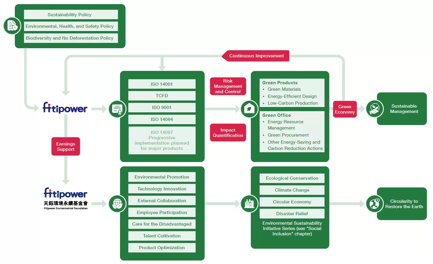 Since the release of the Fitipower Sustainability Policy in 2021 as the guiding principle for the Company's sustainable operations, we have further focused on advancing environmental sustainability and green operations. Upon resolution of the Sustainability Committee, Fitipower issued the Environmental, Health, and Safety Policy, and in 2024 expanded the scope of our policies by introducing the Biodiversity and No Deforestation Policy. These policies serve as the foundation for business operations and management practices, supported by the establishment and implementation of related management systems. In addition, the operation of the Fitipower Environmental Foundation further strengthens our capacity and influence in driving environmental sustainability initiatives.