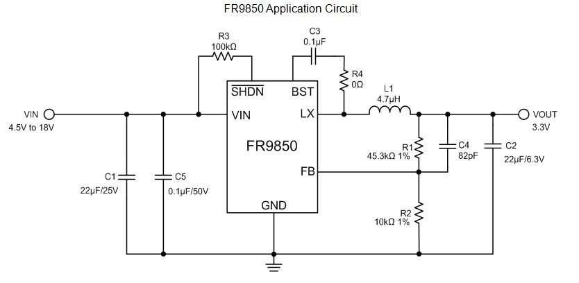The FR9850 is a synchronous step-down DC/DC converter with fast constant on time (FCOT) mode control. The device provides 4.5V to 18V input voltage range and 2A continuous load current capability. Operation frequency depends on Input and output voltage condition. At light load condition, the FR9850 can operate at power saving mode to support high efficiency and reduce power loss.