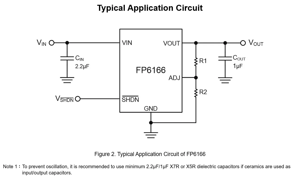 The FP6166 regulator is able to operate with output capacitors as small as 1µF for stability. Other than the current limit protection, FP6166 also offers the on chip thermal shutdown feature providing protection against overload or any condition when the ambient temperature exceeds the maximum junction temperature.