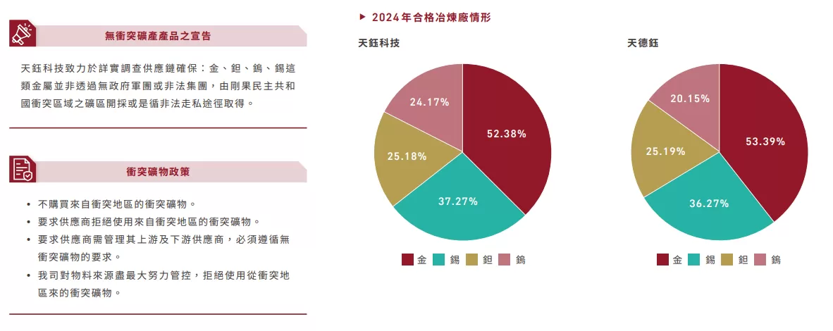2024年共計調查生產相關採購供應商,天鈺科技36家、天德鈺35家,整體回收率達100%。根據調查結果,所有供應商(100%)均採用源自RMI認可冶煉廠所生產之3TG金屬。