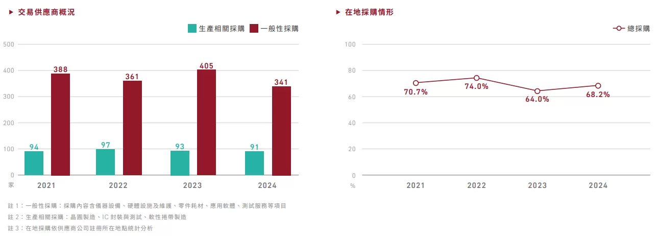 2024年我們合作之供應商共有432 家,當地採購佔比達68.2%,較前一年度上升,主要原因為供應鏈去全球化趨勢,本公司持續調整採購策略,以提升營運韌性與供應多元性。