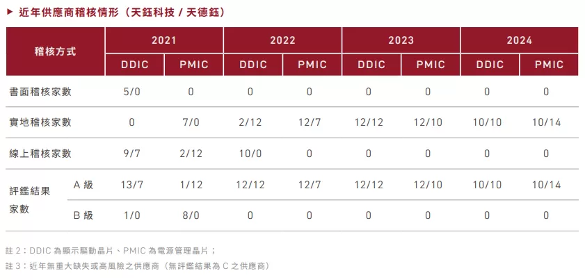 天鈺針對供商進行稽核,項目包含材料管制、矯正措施、人權相關及綠色產品等共計13大要項,新廠商的合作評估則須試產合格且通過上述評鑑後,方能登錄為合格供應商(2024年新供應商使用環境與社會標準篩選比例為100%)。於2024 年度,我們規劃44 家供應商列入年度稽核計畫(天鈺20家;天德鈺24家),實際達成率100%,稽核結果未發現合作廠商有重大缺失或風險之情事。
