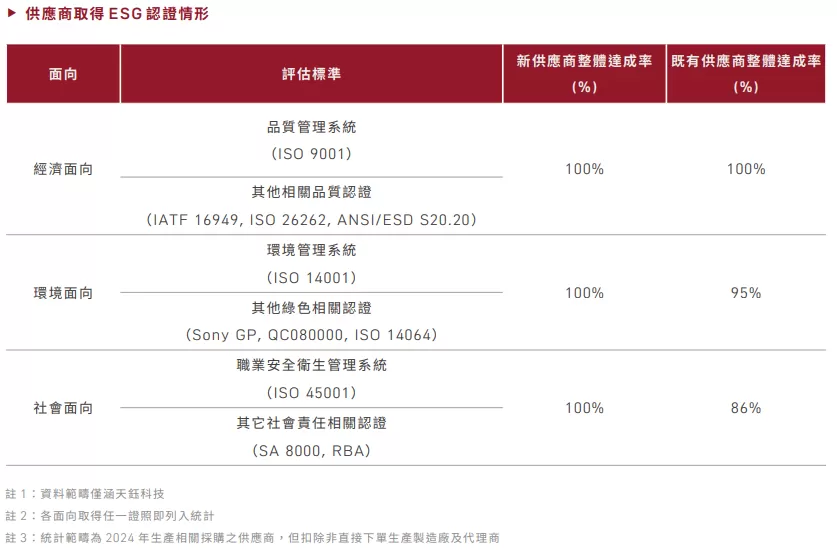 因應國際趨勢與社會關注,天鈺科技滾動式調整供應鏈管理策略。於2023年,我們制訂「天鈺永續供應商承諾書」、「天鈺科技永續供應商行為準則」及「天鈺科技供應商永續風險評估表」,並於2024年初發布執行,要求供應商確實瞭解相關內容要求並署承諾書,我們亦定期透過永續評估問卷,持續追蹤供應商的永續發展情形,並作為天鈺科技供應商採購之評估考量。透過積極的溝通與管理,2024年供應商取得ESG相關認證的情況,各面向均較去年提升。