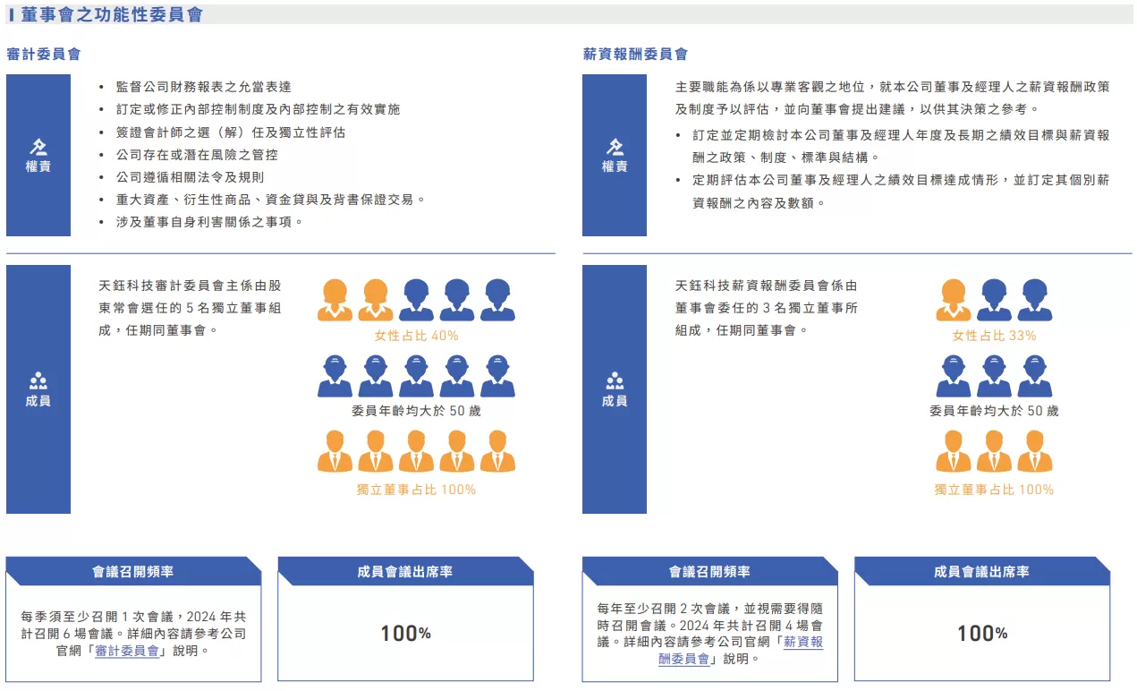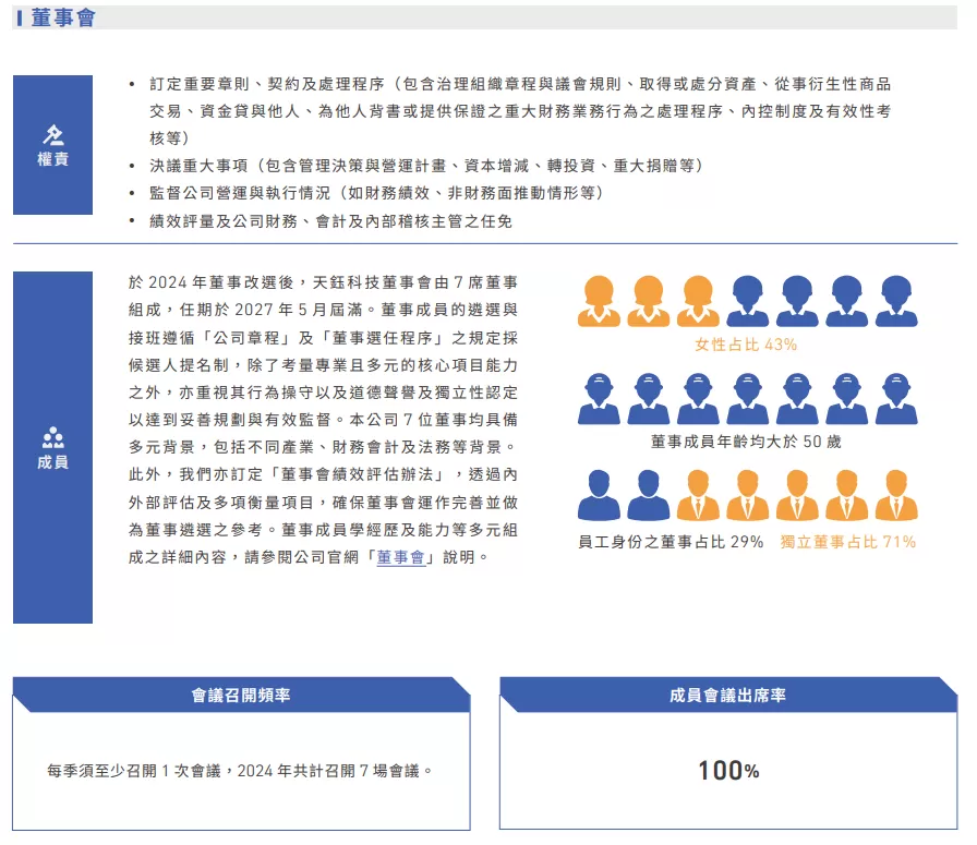 在公司治理的持續精進下,天鈺的董直會組成展現高度多元性與獨立性。2024年女性董事比例達43%,獨立董事比例更達71%,這些努力也反映在治理評鑑表現上,天鈺逐年提升評級,於第10屆公司治理評鑑榮獲「上市公司6%~20%」的肯定。在財務表現方面,2024年天鈺提供產品服務數量達20.4億顆(顯示驅動晶片6.8億顆;電源管理晶片10.5億顆;其他晶片3.1億顆);全年合併營收為新台幣191.99億元,每股盈餘達16.08元。