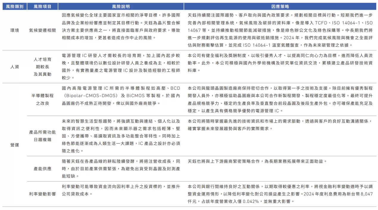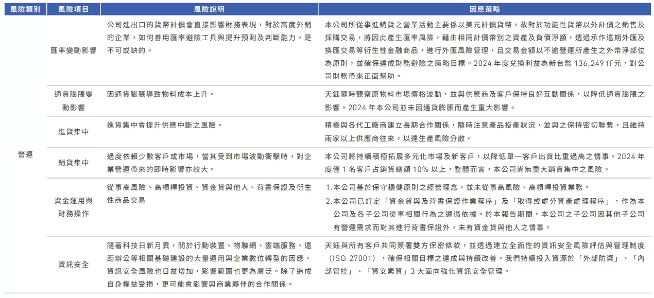 為追求天鈺科技之永續經營,辦理各項業務應適切地評估、有效辨識、衡量、監督與控制各項風險,並將風險控制在可承受之程度內,我們制訂《天鈺科技風險管理政策與程序》作為各單位風險管理之最高原則。